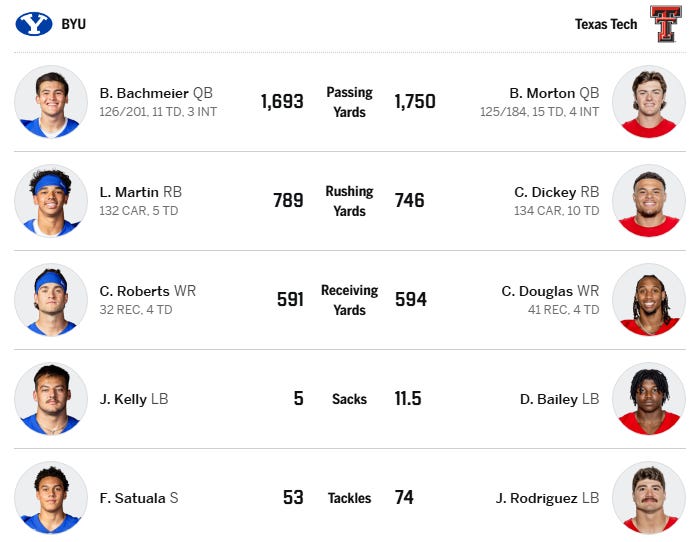 No. 8 BYU (8-0) vs. No. 9 Texas Tech (8-1) at Jones AT&T Stadium, Noon, ABC
