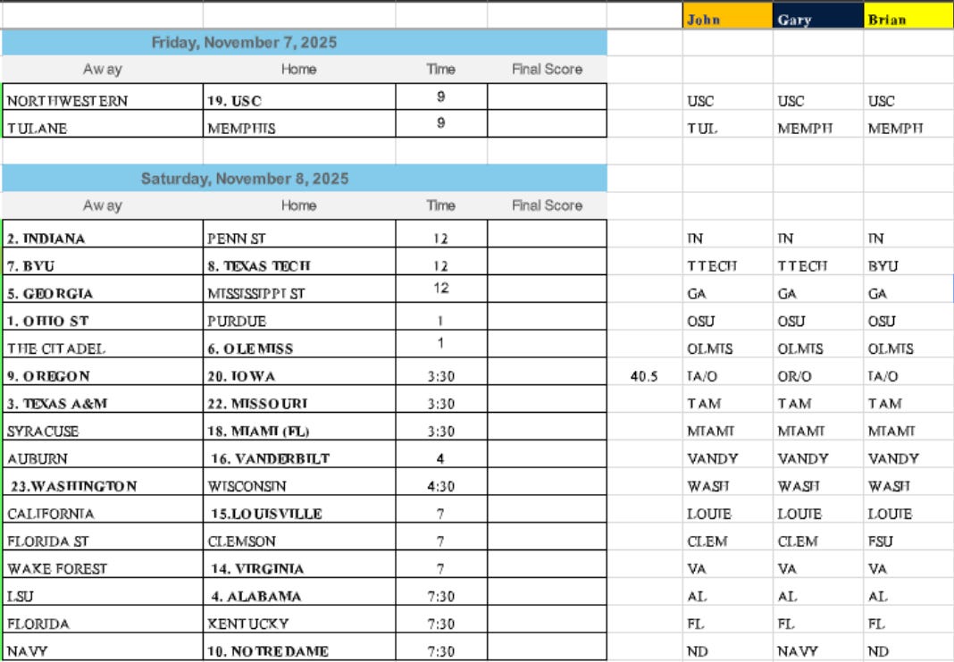 Our resident-college-football-expert John shows his worth last week with a 12-7 winning week, giving him a two-game lead over Gary for the season.