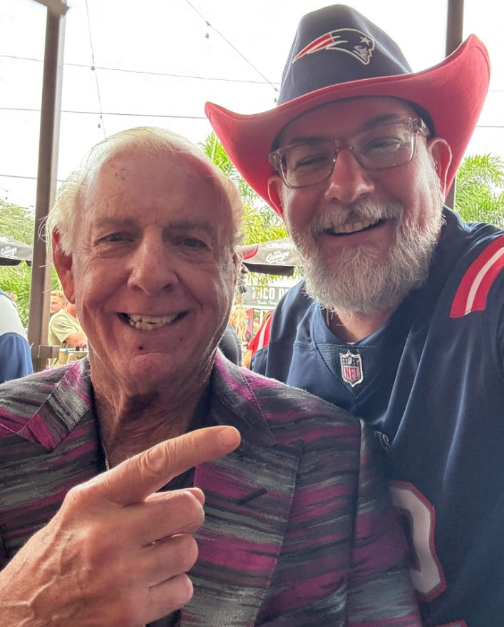 Woooo!: Gary Meets “The Nature Boy” Ric Flair during a New England Patriots watch party at Sunset Rodeo in Tampa, Fla.