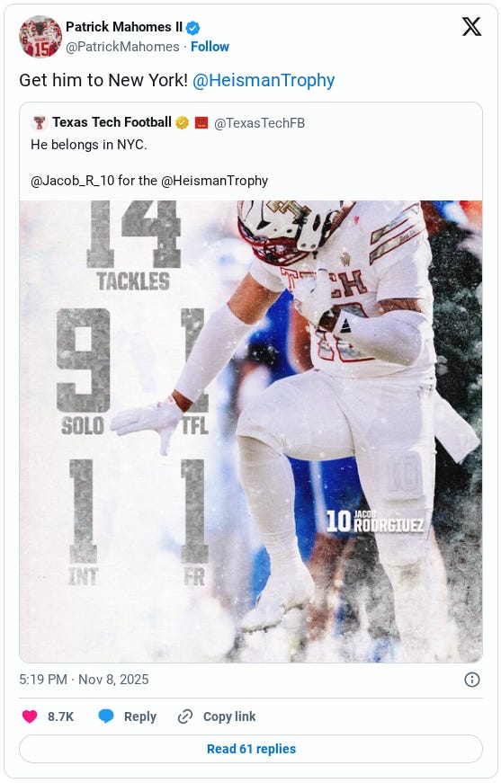 Jacob Rodriguez, LB, Texas Tech: Struck a pose this weekend in 29-7 win over BYU. Is the FBS leader with 7 forced fumbles, 3 interceptions, and has caught the eye of Patrick Maholmes, who posted to his social media: “Get him to New York! @HeismanTrophy.”
