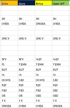 John wins the week, going 9-7, putting him in a tie for second with Gary overall, while Brian holds a precarious 2-game lead for the season with a 45-32 record.