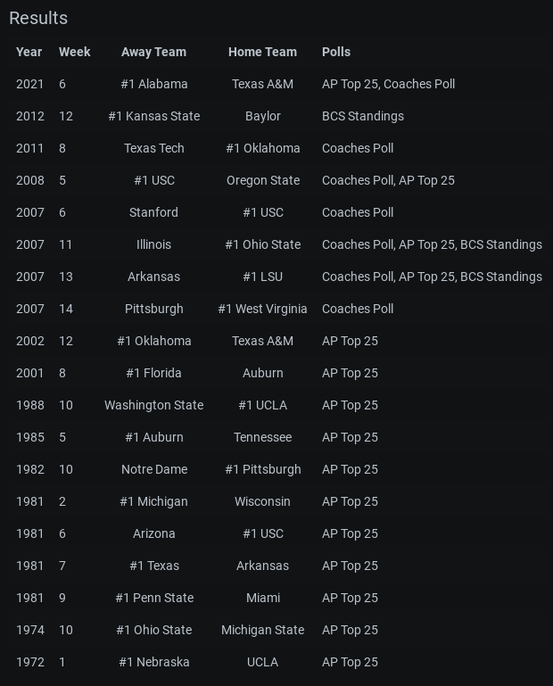 Alabama’s upset loss to an unranked Vandy team wasn’t the first time a No. 1 has lost to an unranked opponent. In fact, it’s not the first time it’s happened to Bama. Below, a list of every time the No. 1 seed lost to an unranked opponent since 1972.