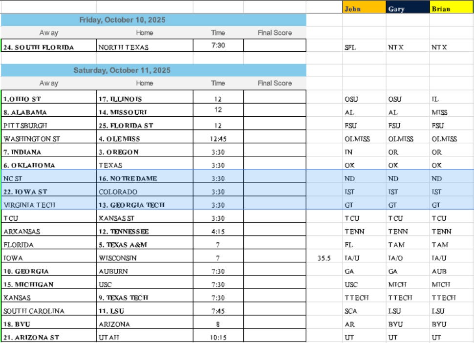 Last Week: John: 16-3; Brian: 13-6; Gary: 11-8.